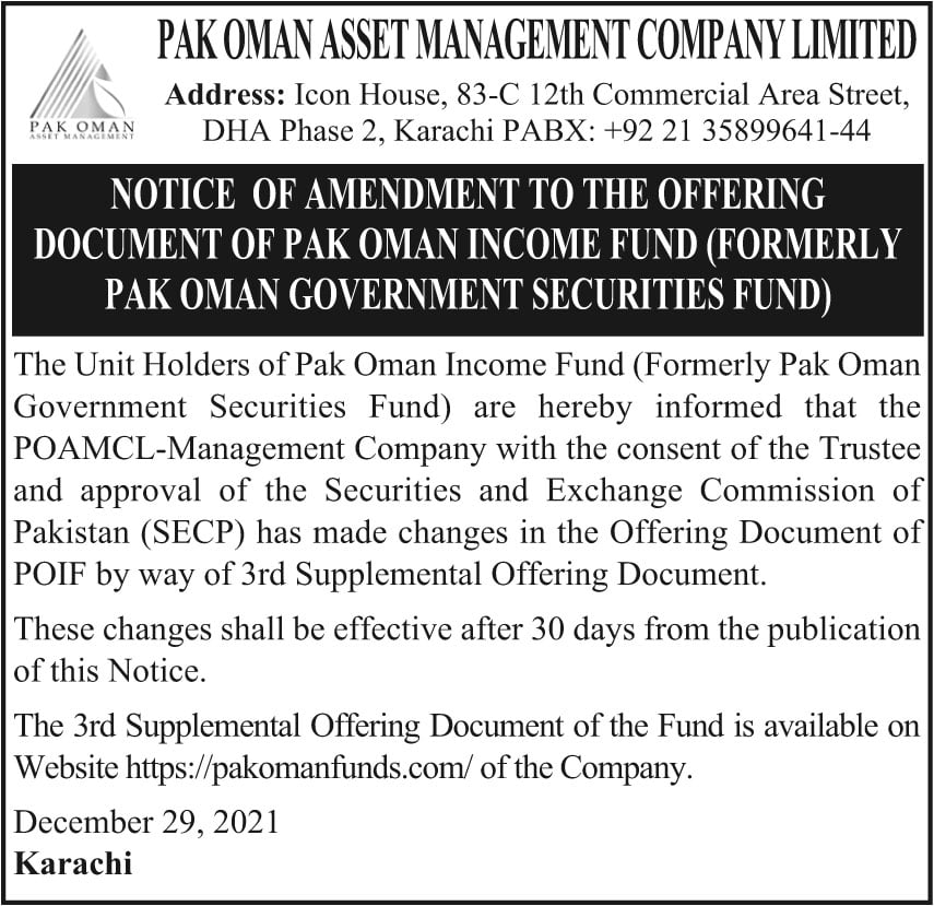 Notice of Amendment to the Offering Document of Pak Oman Income Fund